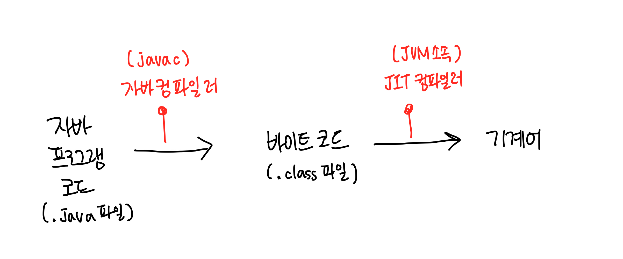 즉, 자바 컴파일러가 자바 프로그램 코드를 바이트 코드로 변환한 다음, 실제 바이트 코드를 실행하는 시점에서 자바 가상 머신이 바이트 코드를 JIT 컴파일을 통해 기계어로 변환한다.