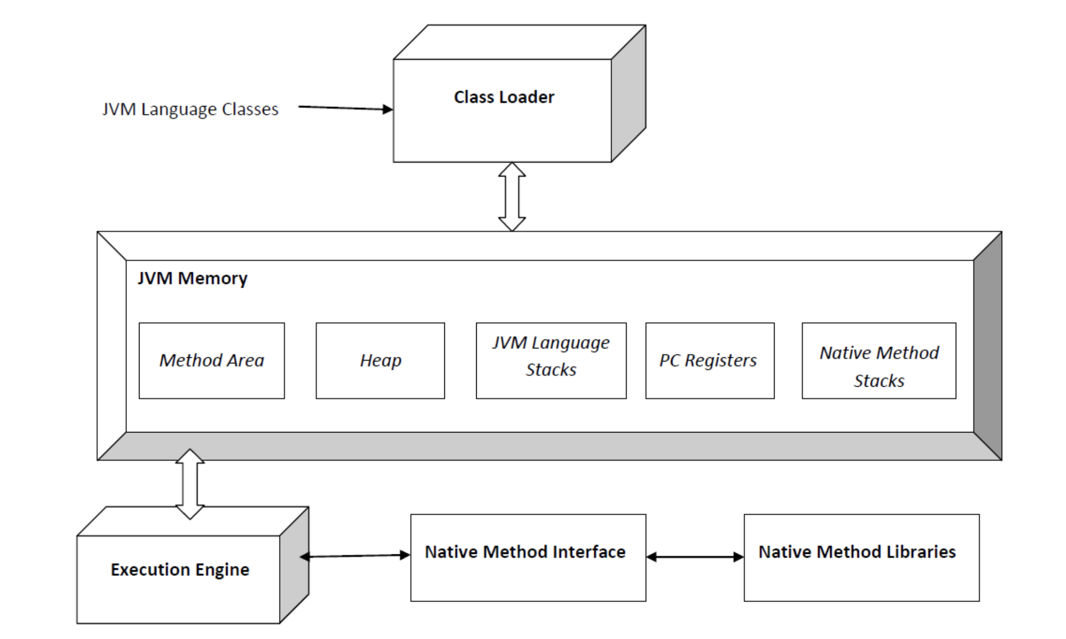 : Class Loader 가 바이트 코드를 JVM Memory에 로드하고, Execution Engine이 바이트 코드를 실행하는 구조이다.