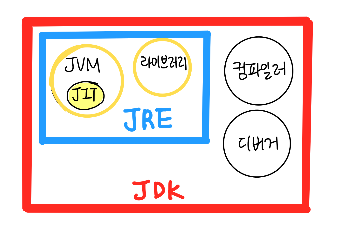 : JRE는 자바 프로그램을 실행하기 위한 라이브러리, 자바 가상 기계, 기타 컴포넌트들을 제공한다. 자바 프로그램을 실행만 하고 개발은 하지 않는 일반인들을 위한 환경이다.