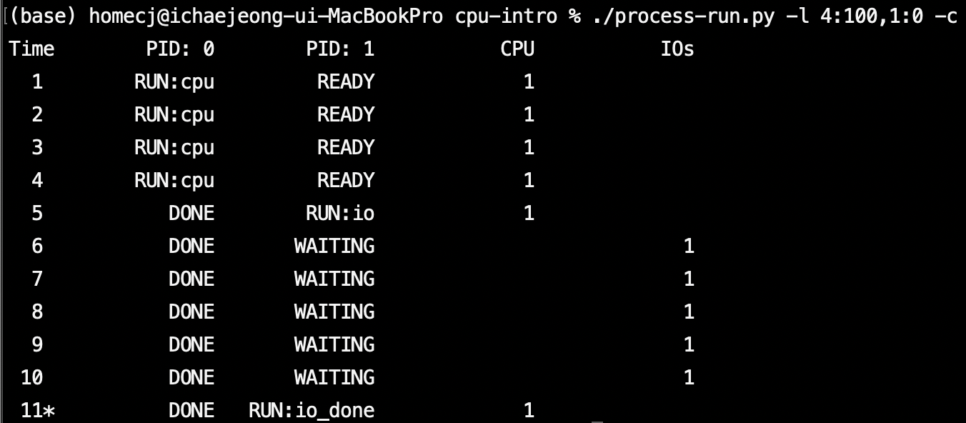 아래의 명령은 4개의 명령어를 실행하고 모두 CPU만 사용하는 하나의 프로세스와 오직 입출력을 요청하고 완료되기를 기다리는 하나의 프로세스를 의미한다. 두 프로세스가 모두 종료되는데 걸리는 시간은 11이다.