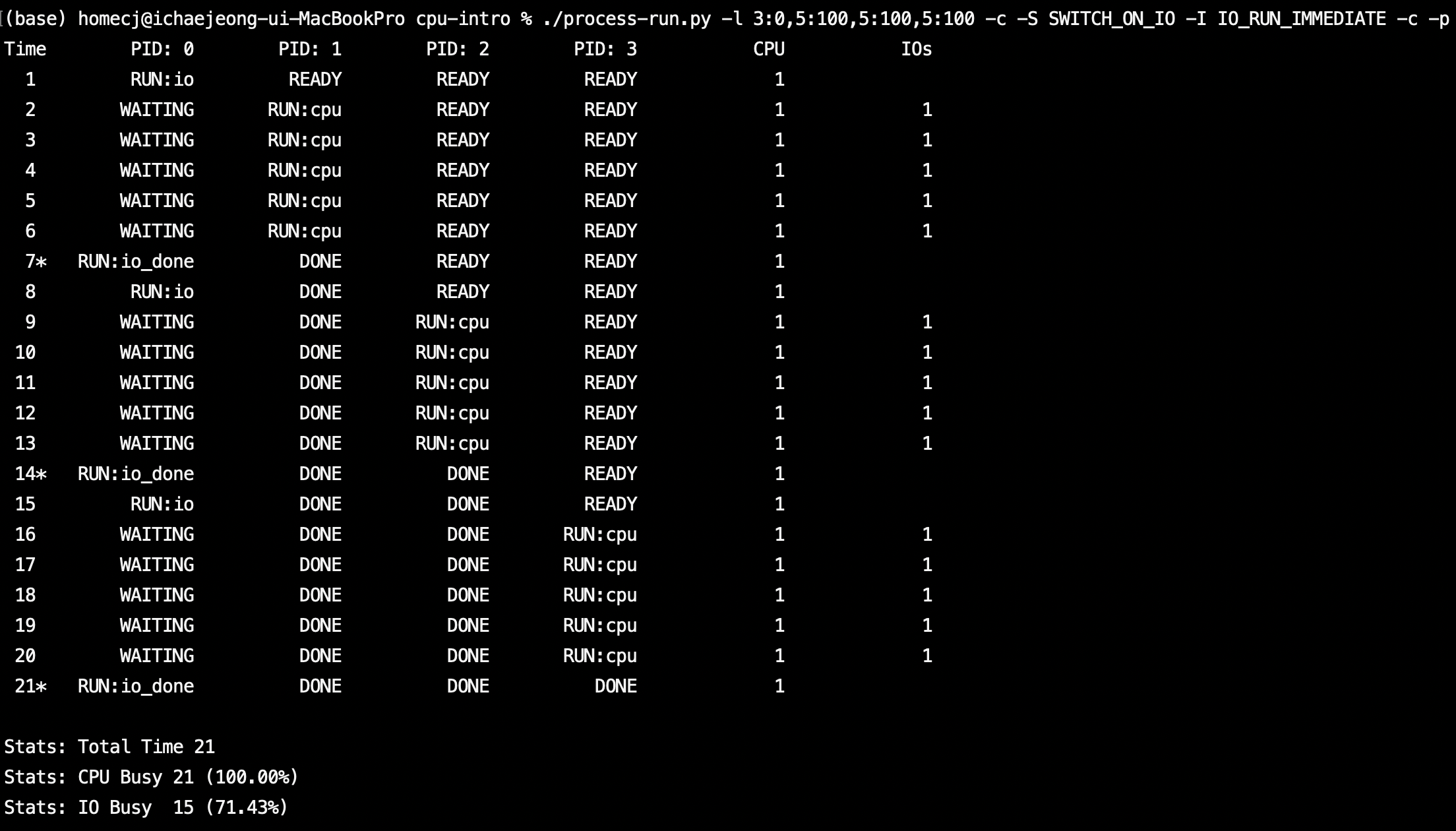 시간이 11에서 7로 줄었다. 이유는 입출력 요청을 먼저 실행시킨 후 PID가 0인 프로세스가 대기 상태일 때